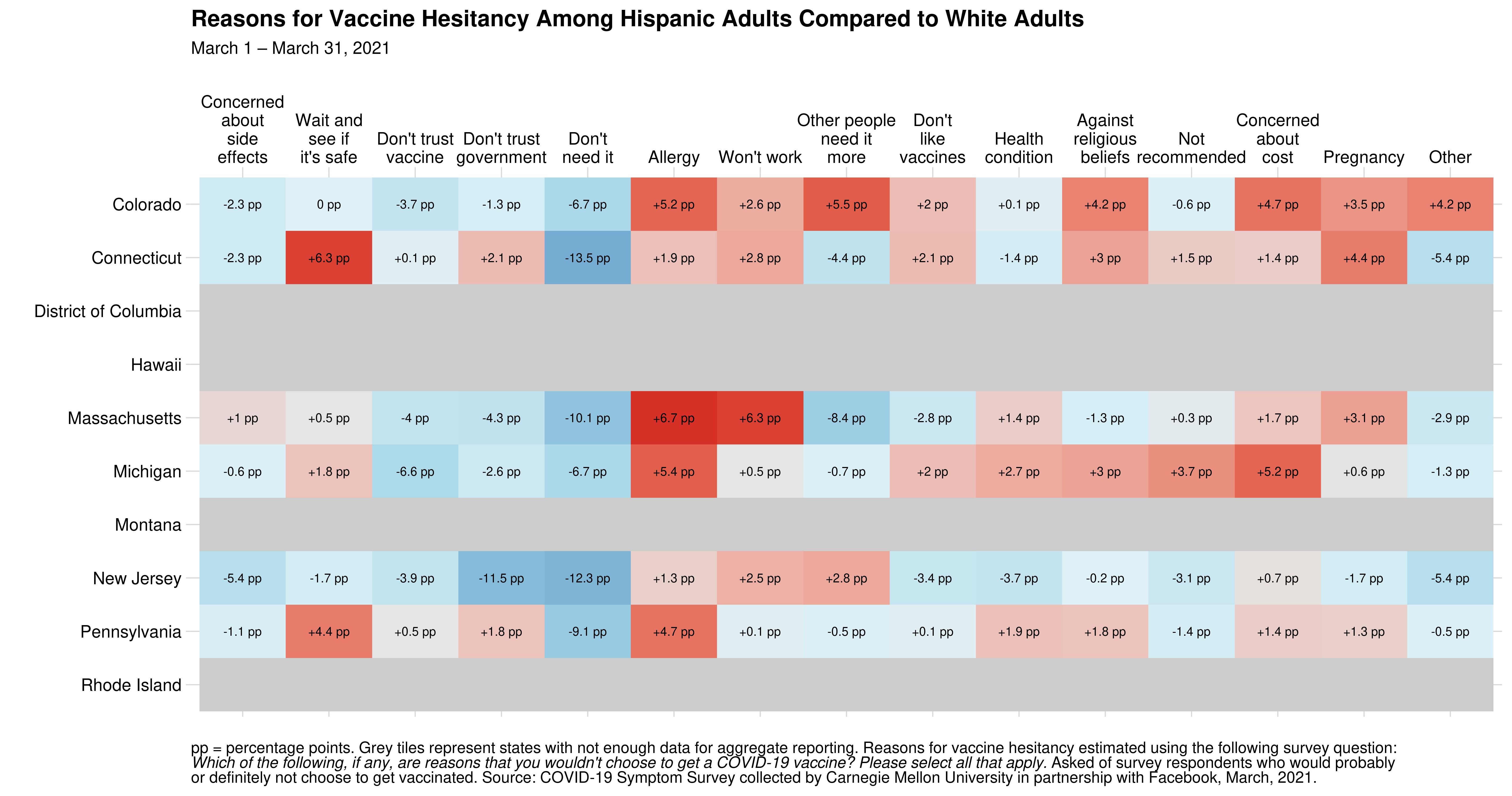 In states with the largest disparities in vaccine hesitancy between Hispanic and White adults (CO, CT, DC, HI, MA, MI, MT, NJ, PA, and RI), reasons for hesitancy among Hispanic adults are shown here: