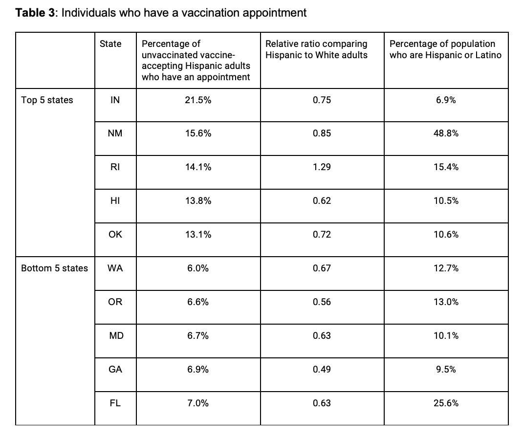 Nationally, the proportion of unvaccinated vaccine-accepting Hispanic adults who currently have an appointment to get a vaccination (9.4%) is much lower than for White adults (15.7%). There is, however, significant disparity by state: